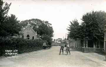Zo is links de heg van het ‘vrijerslaantje’ naar de ingang van het lokaal zichtbaar.