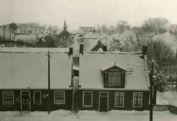 Het is even zoeken waar we hier zijn, op deze foto genomen vanuit de hervormde pastorie. Het huis rechts op de foto is Foeke Sjoerdsstrjitte 3, de bakkerij van Siemen Heeringa vóór de verbouw van 1957 toen het huidige pand grotendeels tot stand kwam.