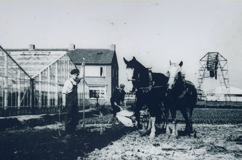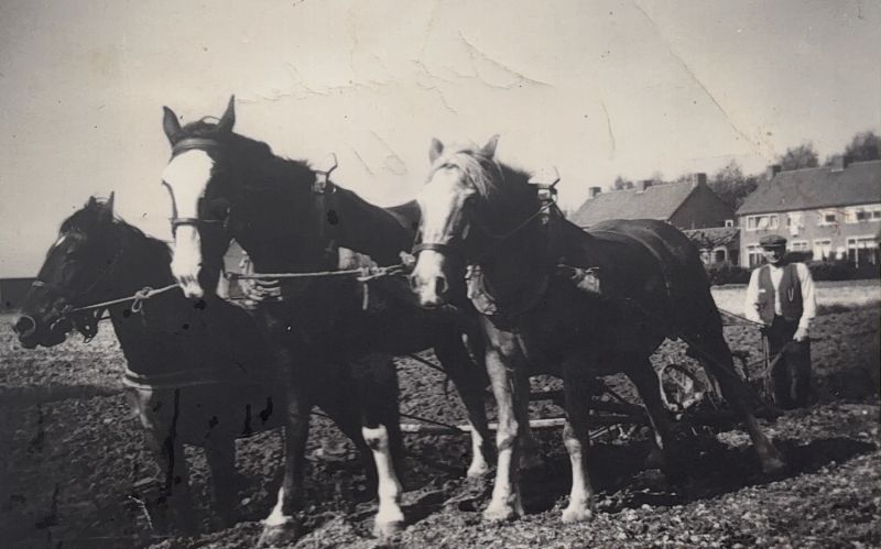 Henk de Vries sr. is hier aan het ploegen met 3 paarden waaronder het Paard van