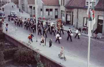 Kinderoptocht tijdens de paardenmarkt in 1965 op de Hoofdstraat thv nr 65 en 67.