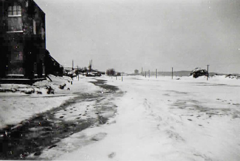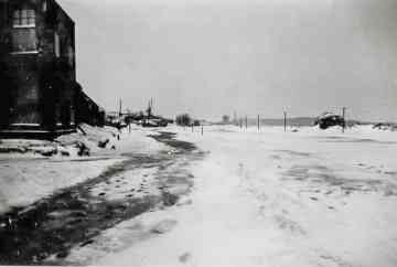 Zicht in de Middenweg vanaf de Punt. Rechts zien we een houten schuur, vervolgen