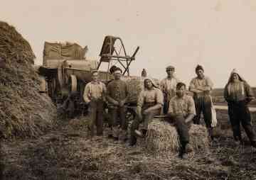 Die zelfde machine is hier te zien op deze prachtige foto van rond 1940. De personen op deze foto zijn veel duidelijker herkenbaar dan die op de andere foto, maar helaas is er maar één persoon echt bekend: de man geheel links is Fokke Meinsma van het in 1910 gestichte boerderijtje op it Ald Each.