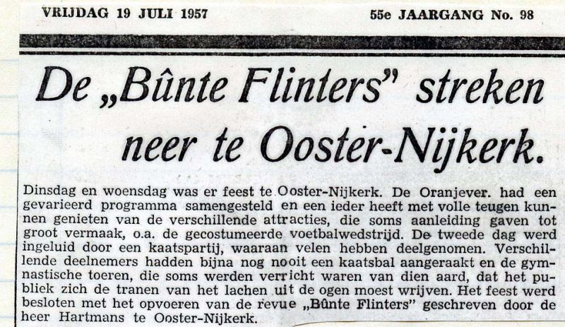 In de jaren ’80 van de vorige eeuw nam de toneelploeg van Easternijtsjerk de naam ‘De Bûnte Flinters’ aan en in 1991 tijdens de eerste dorpsreünie is de oorspronkelijke voorstelling nog eens opgevoerd.