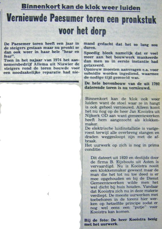 Tot de ‘echte’ klokkenman van de gemeente ermee ophield en Kooistra de vraag kreeg om die taak over te nemen. Hij verdiepte zich er in met als resultaat dat de gerestaureerde Peazumer toren weer een klok kreeg die kon luiden en de uren aangeven