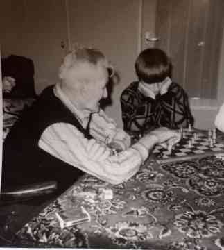 Foto pake Fokke schaakt met Anne, Albert (12 jr) kijkt toe