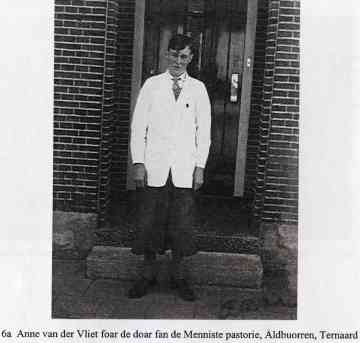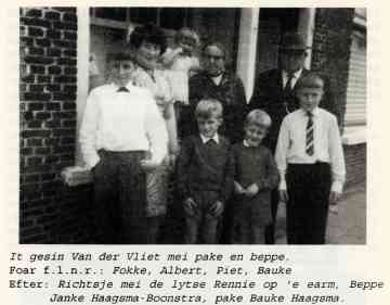 “Ik ben 73 jaar geleden geboren in Witmarsum (zo steekt Anne van der Vliet van wal). Niet dat ik daar nog veel van weet, want al vrij snel verhuisden we naar Easterein. Vader was arbeider bij de boer en in die tijd was het gewoonte dat arbeiders vaak verhuisden, ons gezin wel zes keer. Dat gebeurde meestal op ‘Alde Maaie’, op 12 mei. De wegen waren dan vol van arbeiders die met paard en wagen van de boer naar een andere plaats gingen. ’s Morgens molken ze nog bij de oude boer, daarna moest alles worden overgebracht (zo veel had men toen niet) en ’s avonds molken ze al bij de nieuwe boer. Moeder moest maar zorgen dat de hele boel een plek kreeg. We waren thuis met z’n vieren. Ik was de oudste, dan kwamen mijn beide zusters Pytsje en Geartsje en onze Ulbe was de jongste. Ulbe noemt zichzelf nu Albert want hij woont in Canada en daar kan men de naam Ulbe niet zo goed uitspreken. Hij is direct na de oorlog vertrokken en één van mijn zusters zit daar ook. Het is nu bijna 40 jaar terug en toen dachten we dat het een afscheid voor het leven was. Later zijn ze hier een aantal keren geweest en een paar jaar terug zijn wij daar ook geweest. Ja dat is allemaal veranderd, “tiden hawwe tiden”.