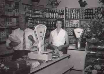 Cor Bol druk doende achter de toonbank en weegschaal. Links mevr. A. van Dijk-Le
