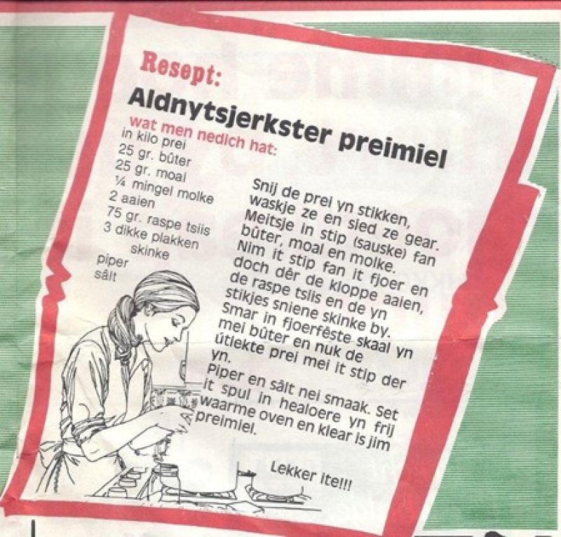 Broer Adema heeft een tijdje terug in de serie “Hoe is it no mei...” gestaan en toen bleek dat hij nog een prachtig foldertje van zijn 4=6-winkel had met daarin het recept voor een “Nijtsjerkster Preimiel”. Dat is zo mooi (vooral dat ‘nuk de útlekte prei der yn” past heel goed in het Nijtsjerkster idioom!), dat willen we jullie niet onthouden. Een mooi aandenken aan de familie Adema!