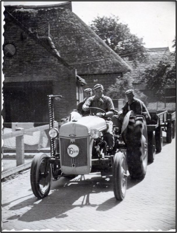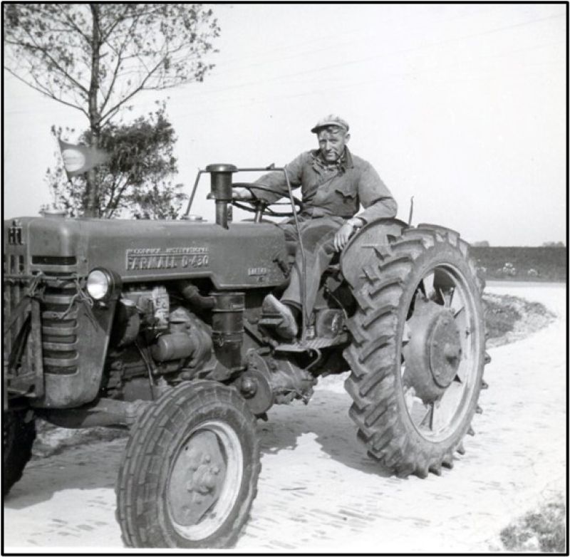 Douwe Kuiper is niet zo groot, hij valt bijna weg bij deze grote tractor. Er zit nog geen beveiliging op deze tractor, dat is heel anders vandaag de dag.