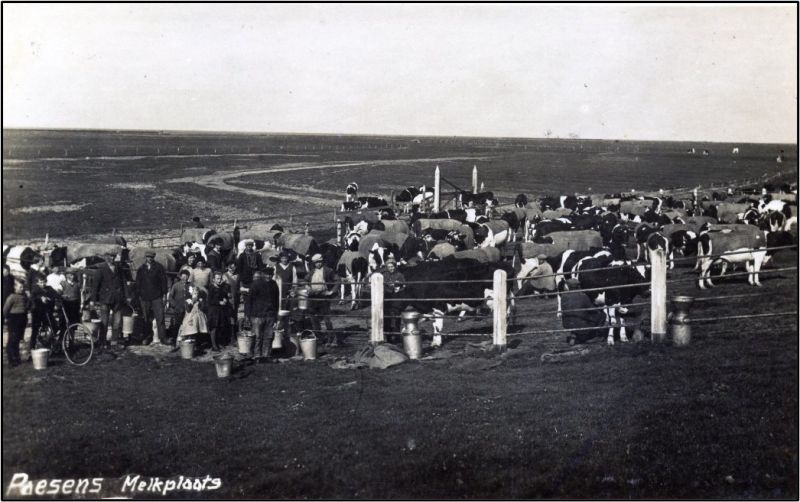 Om negen uur kwamen we thuis voor koffie, dan nog eens naar het land en om twaalf uur warm eten. Drie uur 's middags was er thee en daarna begon het melken. De koeien liepen achter de dijk, zoals bijna alle koeien van de boeren in beide dorpen aan de zeedijk, ze werden daar ‘ynskaard’ (bijeengedreven), zo werd het genoemd. Een oppasser haalde de koeien als het melktijd was, maar onze koeien herkenden heit al van ver. Hij riep ze en dan kwamen ze meestal als eerste aangerend, omdat ze wisten dat ze een koekje kregen! Na het brood eten 's avonds, moest ik meteen naar bed, later werd dat natuurlijk wel anders.