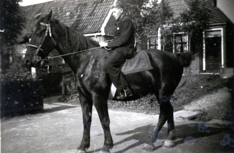 Douwe Kuiper als ruiter, op de achtergrond het ouderlijk huis