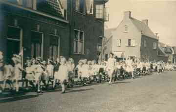 In optocht door het dorp. Hier op de Hoofdstraat voorbij de kruising met de Broe