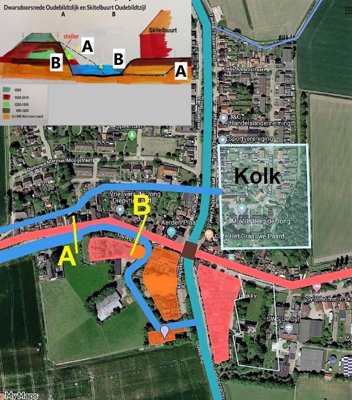 1505-1580 (afb. 2.) In 1505 kwam er een nieuwe sluis op dezelfde plek en de Ouwedyksterfaart-zuid/noord werd uitgegraven voor aanvulling van de dijk. Dit was bij de Skitelbuurt geen sinecure, want inmiddels waren er huizen gebouwd en de eerste bewoners van ‘e Syl hadden zich al genesteld aan de Skitelbuurt en Keuningsstreek, achter de zomerdijk en de hogere en brede Aerden Plaats. De vaart werd daar smaller en er moest hiervoor nog meer ruimte worden gemaakt.