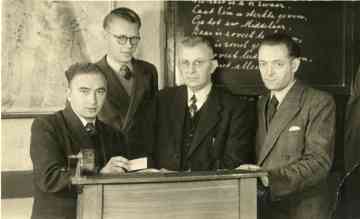Onderwijzer Bote Hazenberg, Freerk Brouwer, Rienk Blom, de onderwijzers Djoke Ypma (met bril) en Bauke Folkertsma.