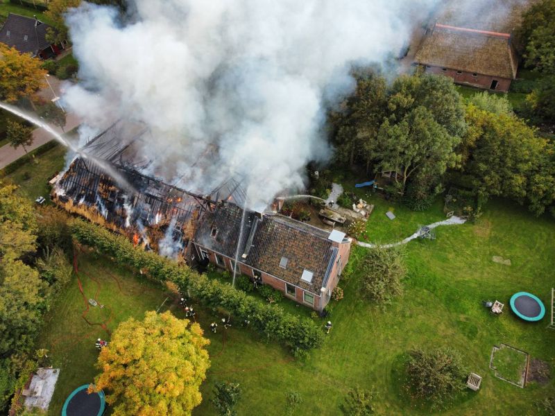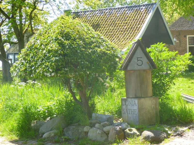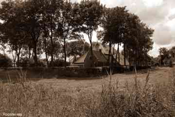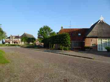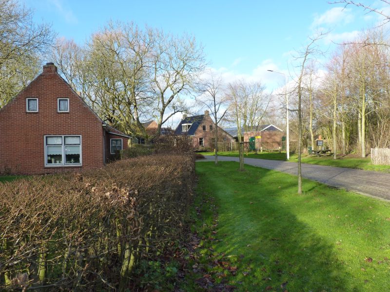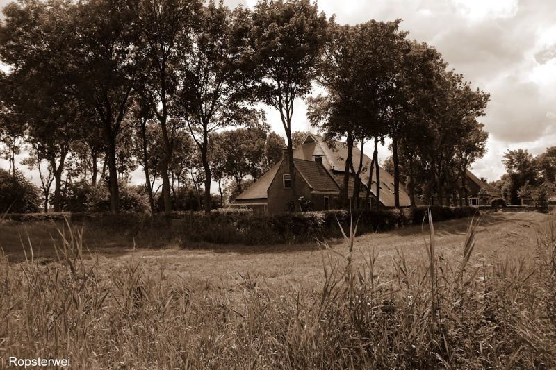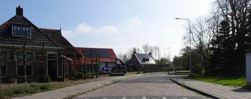 De oude slingerende weg richting Ropta en Mitselwier. Dat slingeren wijst op een hoge ouderdom, mogelijk dat er een oude zeedijk in is te herkennen. Zeker gezien de blokverkaveling ten noorden van deze weg is dat goed mogelijk. De twee woningen die op deze foto te zien zijn, zijn jarenlang bewoond door leden van de familie Jongeling. Het linker huis door Thijs Tjeerds en na hem zijn zoon Sijbe Thijses Jongeling. Sinds lange jaren woont er een Kooistra, eerst Harke en nu zijn zoon Marten Kooistra. Het huis midden op de foto is het voorste stuk van een gardeniersbedrijf, het hoge dak tussen het huis en de boom is het dwarsgeplaatste achterstuk waarin de stal en de schuur waren gevestigd. Het laatst woonde Dirkje Heeringa-Jongeling er, dochter van Ype Jacobs Heeringa (die er ook een fouragehandel dreef) en getrouwd met Tjeerd Sybes Jongeling, voordat zij naar Doktersfiif verhuisde. De woning stond toen jarenlang leeg en verwaarloosde totaal. In 1991 brak Rienk Terpstra alles af, het boerderijgedeelte werd niet meer opgebouwd, het voorhuis verrees in oude stijl. Later werd er een schilderswinkel bij gebouwd op de plek van de oude schuur. Het achterstuk van een boerderij geheel rechts op de foto is van Johannes en Jel Blom-Boersma (Jel was bij de jeugd beter bekend als ‘Beppe Aai’ omdat ze kippen hielden en jarenlang eieren verkochten) aan de Langgrousterwei 15, nu staat daar een keurige woning met daarachter een grote (voormalige timmer-)loods van de familie Solle.