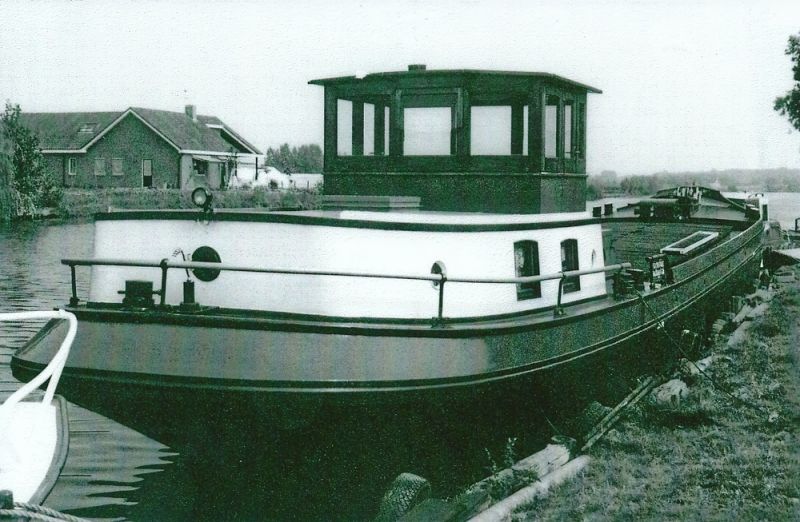 Duwbak met schip passeert de brug over de Wassenaarse watering.