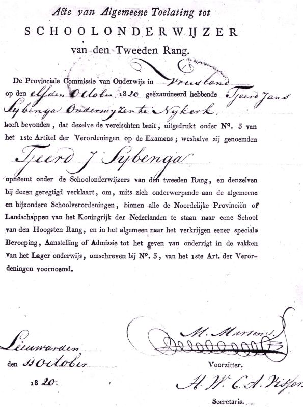 Hy docht op 11 oktober 1815, at er 18 jier is, eksamen foar de tredde rang. Hy is dan al ûndermaster yn Wergea mei de 4e rang. Yn 1820 hellet er ek noch de 2e rang, sjoch de akte hjirnêst, mar heger komt Sybenga net.
