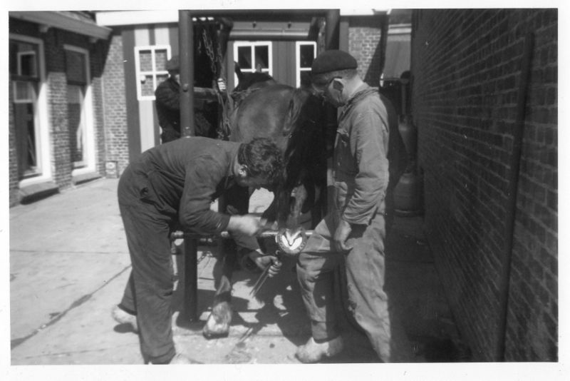 Op de tweede foto wordt Lucas beslagen. Het paard van Lieuwe Jacobs Elzinga van de Langgrousterwei wordt beslagen door smidsknecht Anne Sonnema, terwijl zijn baas Pieter van Driesum toekijkt en met zijn knie de hoef van het paard ondersteunt. Deze foto moet gemaakt zijn omdat het de laatste keer was dat de firma Van Driesum nog een paard zou beslaan in de ‘njidstâl’ die op de ruimte tussen Langgrousterwei 4 en 6 geplaatst stond. Anne Jan Sonnema was jarenlang werknemer van de firma Van Driesum, in 1985 al meer dan 32 jaar. Hij kreeg zijn opleiding veelal in de praktijk van de oude Anne van Driesum en toen die ‘leerling’ Anne Sonnema eens zou laten zien hoe je een kettingkast maakt en daarbij iets te haastig te werk ging en de kast niet helemaal paste, merkte hij droog op: “Sa kin ik it ek wol”, waarna zijn leermeester bijkans ontplofte!