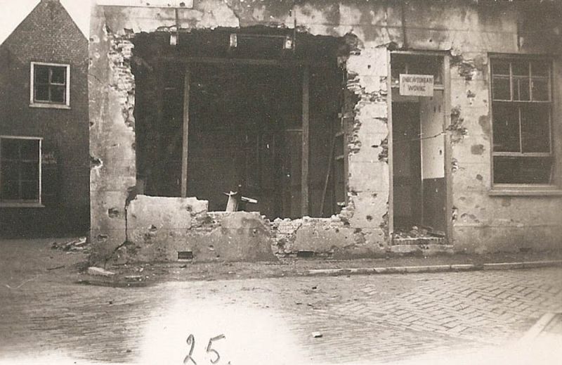 Een triest aanziende foto van oorlogsschade van bebouwing aan de Hoofdstraat. De