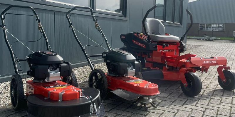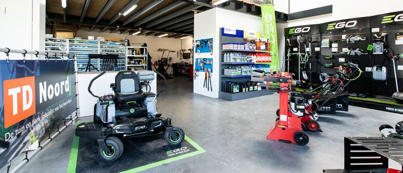 Er staan diverse prachtige maaimachines en ander tuin- en parkgereedschap in de showroom en voor de winkel.