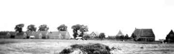 Op de tweede foto gaan we verder de Langgrousterwei langs. Helemaal rechts het laatste blokje van twee woningen uit 1919-1920, gevolgd door een achter de bomen onzichtbare woning van voorheen de familie Lolkema, nu woont Petra Haaksma er. Dan de loodsen van transportbedrijf Wijnsma (handel in metalen en oud papier), waarin later ook kippen werden gehouden, dan het boerderijtje van de familie Weidenaar, later Siebe Marten Cuperus. We vervolgen met het boerderijtje/loonbedrijf van Siebe Dorhout en tenslotte de rond 1750 gebouwde boerderij van de families De Beer (tot 1954) en Weidenaar, later Holland Crop en nu het bedrijf VDB van Johan van Driesum. In de ‘kop’ van deze boerderj was Henk Heeringa de laatste bewoner.