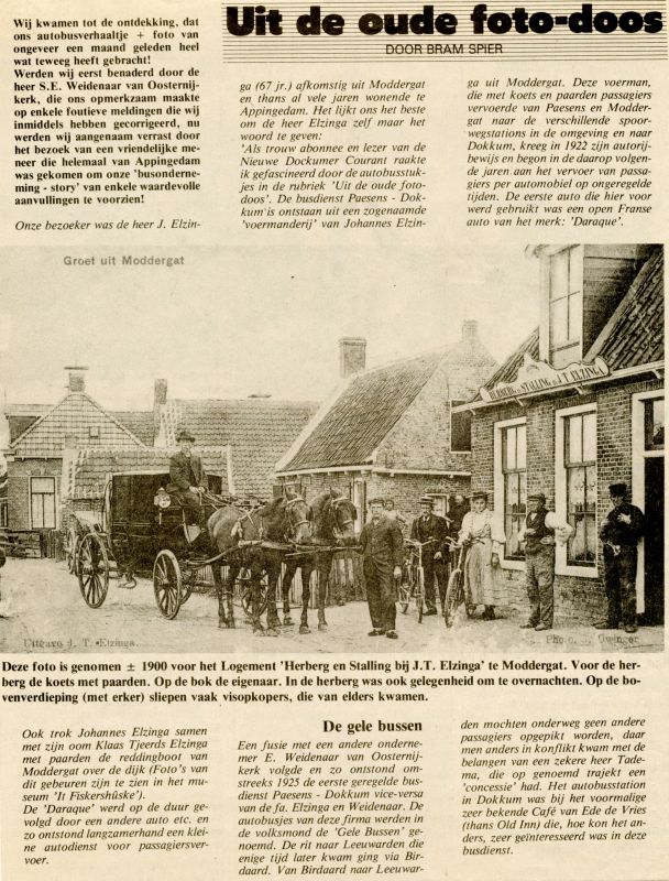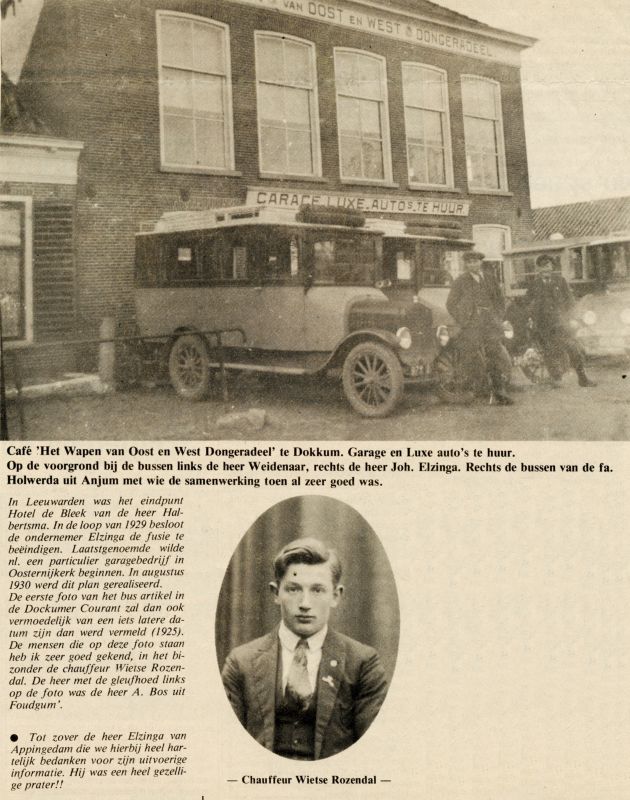 Daarna had Eelze samen met L.T. Elzinga een busdienst van Peazens naar Dokkum. In 1922 reden de eerste bussen al, maar in 1928 komen we ze beide (voor het eerst) tegen in de Dockumer krant.