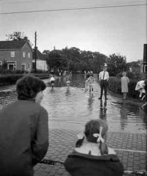 Helemaal rechts op deze foto staat Wieb Torensma en naast hem zijn zwager Evert van der Veen. Het jongetje dat heerlijk in het water speelt is Piet van Ruurd en Hittje Torensma. Aan de overkant van de straat loopt, met de handen op de rug, Jacob van der Veen, vader van Evert. Op de achtergrond staan de 8 woningwetwoningen die de Woningstichting in 1919 heeft gebouwd. Het waren de eerste niet-particuliere woningen in ons dorp. Na de bouw van de bejaardenwoningen aan de Doktersfiif zijn ze afgebroken.