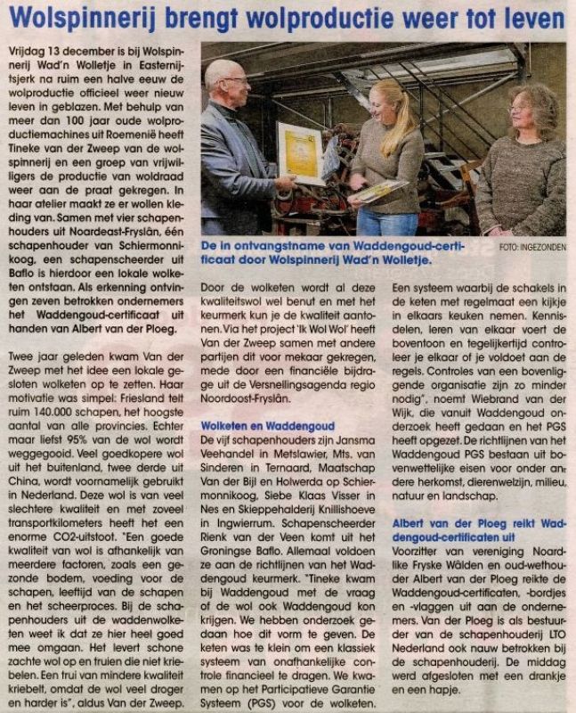 Met een voor Tineke bekende scheerder Reinier van der Veen en 5 schapenboeren (Knillishoeve-Ingwierrum, Jansma-Mitselwier, Visser-Nes, de Groot-Ternaard en Van der Bijl-Schiermonnikoog) heeft Tineke een keten opgezet om te kijken, kennis te delen en heel veel te testen om een goede wolkwaliteit te kunnen leveren met schapenwol uit eigen regio, wat erg duurzaam is en een kleine voetprint heeft. In samenwerking met Dierenartsenpraktijk Dokkum en de WUR (Wageningen Universiteit) heeft dit geresulteerd in een certificering van het keurmerk Waddengoud voor de hele keten. Dit vond plaats op 13 december 2024 in de spinnerij. (Zie artikel in de Actief 18 dec 2024.)
