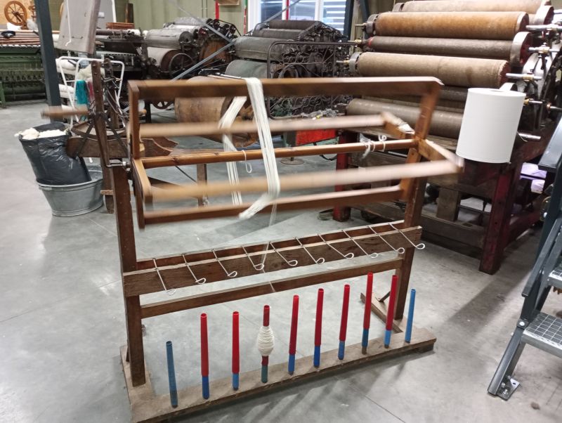 de wolpikker, de kaarder, de condensor, de spinmachine, de twijnmachine en de haspel. Twee machines werken handmatig, de rest op krachtstroom motoren.