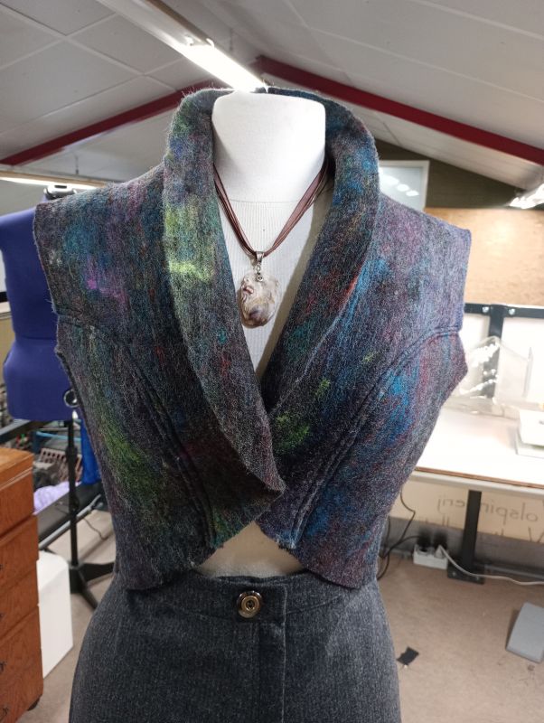 Muska maakt van een uit wol gevilten lap stof een bolero met sjaalkraag.