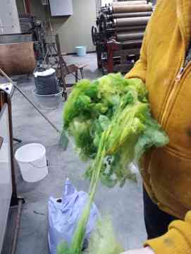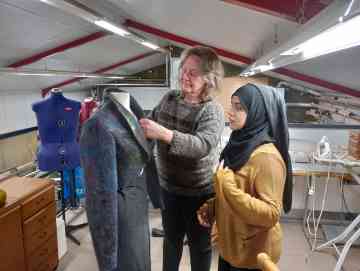 Tineke werkt deze dag met haar stagiaire Muska Shegewall, zij studeert in Leeuwarden, Firda 2e jaars Fashion Design. Ze komt uit Afghanistan, studeerde daar rechten, maar is erg creatief, doet nu de fashion opleiding en maakt prachtige kleding van stoffen die ze zelf heeft gemaakt in de spinnerij van Waddenwol.